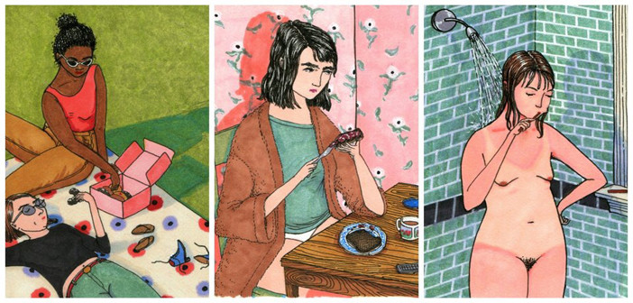 A girl taking a morning shower, brushing her teeth, and showing off her sunburned body. With her hand on her hip, she looks comfortable in her own skin. “It’s important that the women I draw aren’t rail thin with huge boobs,” Nixon added. “I think there are enough images of bodies like that out in the world. The ladies I draw typically have small-ish, droopy breasts and thick thighs. They’re kind of lumpy but in an attractive way. Just like real people.”