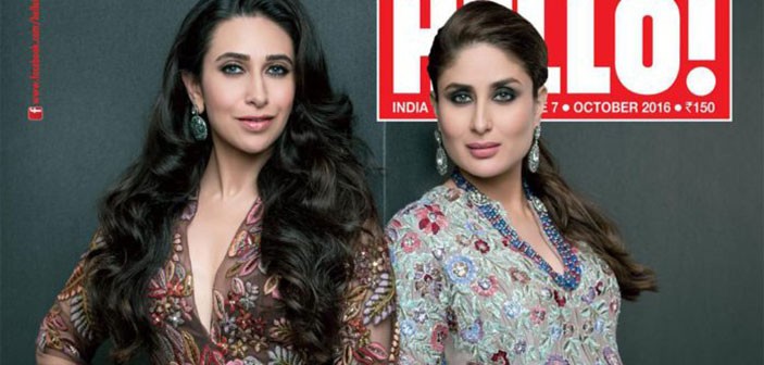 Kareena graces the October cover of Hello! magazine along with sister Karisma. The two look totally queenly, radiant and graceful on the cover. They are wearing an embellished lehenga with an Anarkali kurta from Manish Malhotra’s collection.