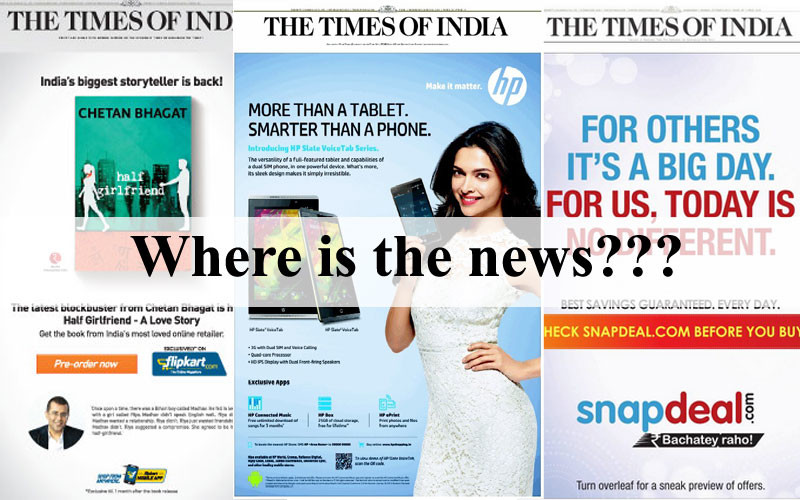 When newspaper comes there is no front page headlines. There is just advertisements. Full page advertisements. Not on one page but many of the starting pages are full of them. We wonder if we should still call them newspapers or adpapers. Ads in them are much more than the actual news.