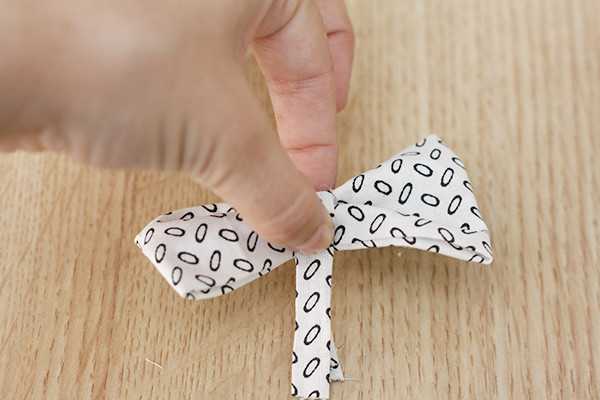 Put a dab of glue on the front of the accordion-ed bow. The side with the seam will be on the back.