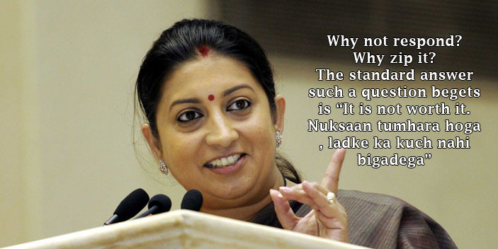 And suddenly the rules change. You, the creature who on every podium exalts the right of women to speak their mind is told don’t speak your mind. Ignore the trolls no matter how high they serve in their political systems. Ignore public attempts to humiliate you through sexual innuendos “kyunki nuksaan tumhara hoga unka kuch nahi bigadega”.