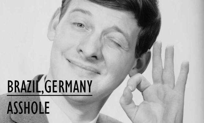 However the meaning in Brazil, Germany and a few Mediterranean countries: the circular shape of the gesture gives it the meaning of “anus”, and is therefore used to call somebody an “asshole”, or, by extension, a homosexual.