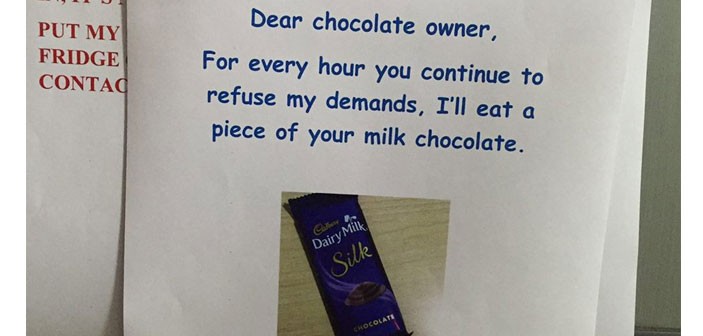 This tragedy happened at one such office and the events later took a hilarious turn with the exchange of notes between the chocolate owner and the thief, ransom notes and the intervention by the HR.