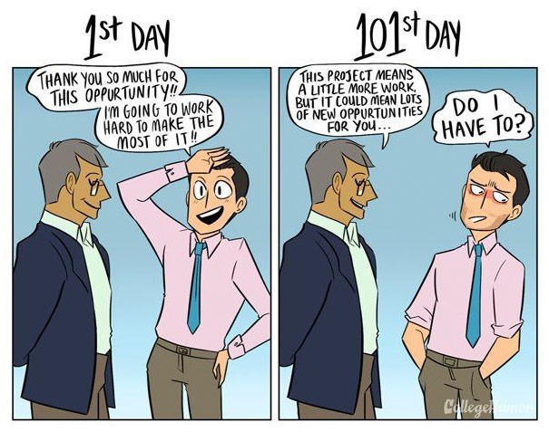 Karina Farek and Willie Muse have drawn a few illustrations for College Humor that are spot-on in depicting how things change from 1st day to 101st day. All these are so relatable that with every illustration we could not stop ourselves from saying so true.