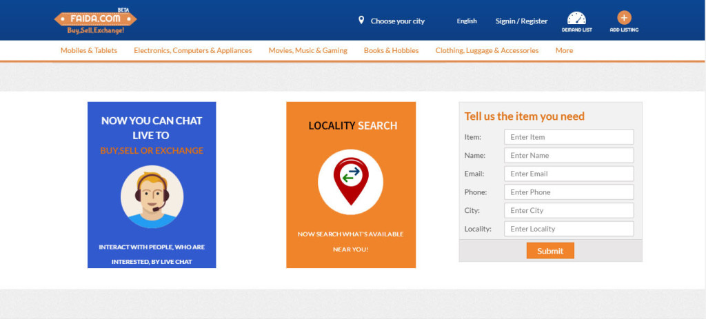 Initially started as a simple listing and exchange option portal, the business model broadened its’ horizons to include buy and sell option to make it more beneficial for its’ customers. The portal boasts of dealing in multiple categories of products ranging from electronics(mobile,tablets,computers,games, consoles, appliances) to books,clothing, accessories, furniture,home decor and many more. The impressive range of products can surely fulfill your diverse ranging needs which makes this venture one of its’ kind. Not only this, the portal comes with a locality search feature where one can search what is available near them. Also, to make buying/selling/exchanging more convenient, they have a chat option where one can directly interact with the other transacting party.There is a demand list where one can check out things demanded by other people and also add your listings.