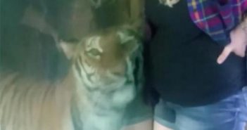 A video of a tiger caressing up against a pregnant woman’s belly through the glass…